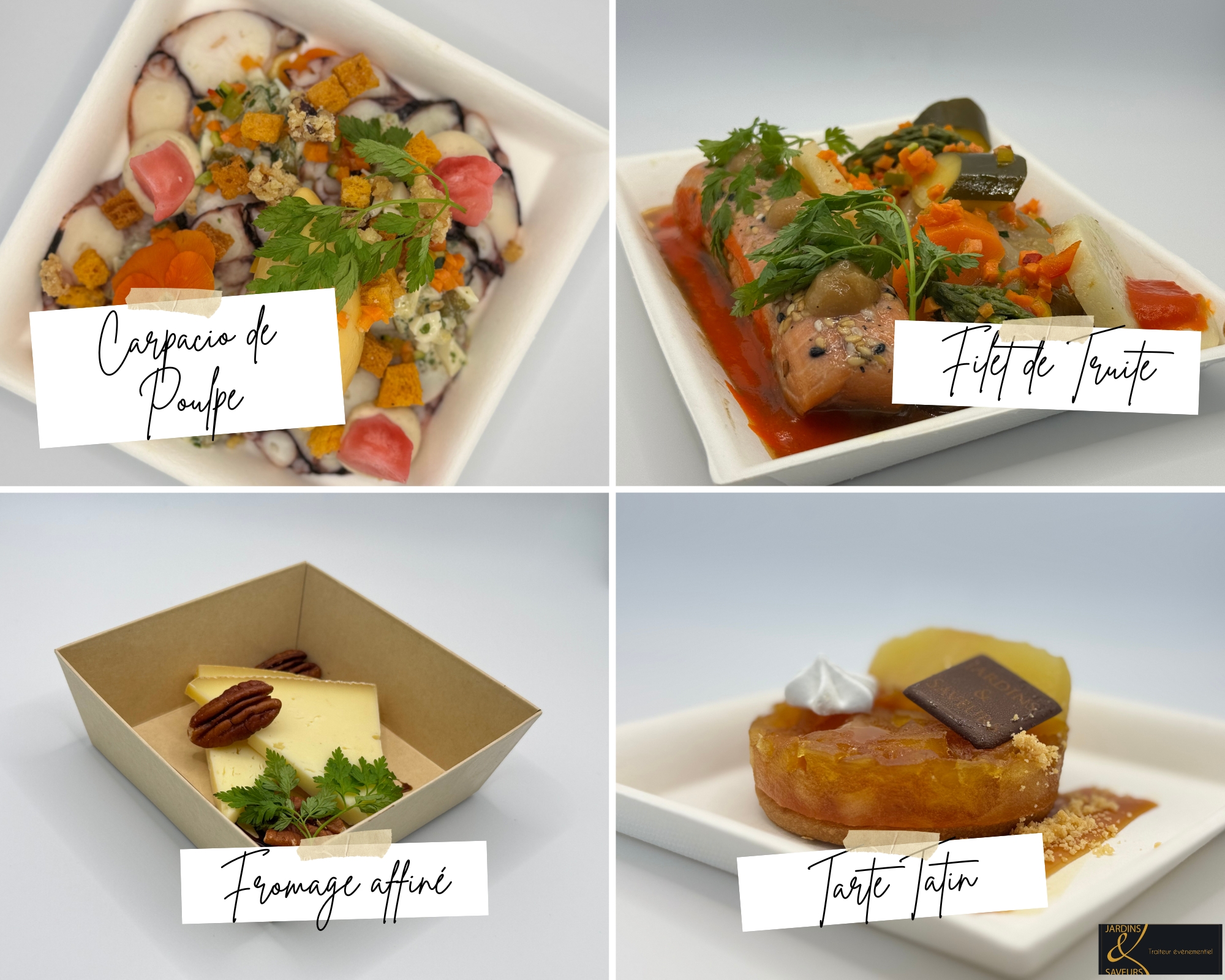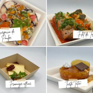 Plateau repas pour une personne avec entrée, plat et dessert sur le thème des produits de la mer